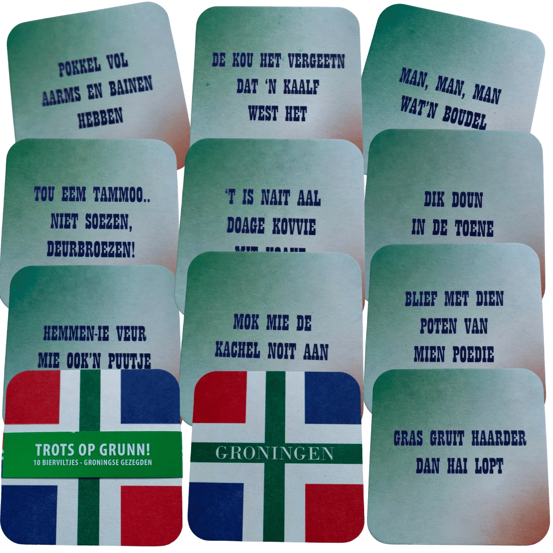 Groninger bierviltjes met Groninger spreuken Een pak met 10 Groninger bierviltjes met op de achterkant een Groninger tekst. Er zijn 10 verschillende Groninger spreuken.