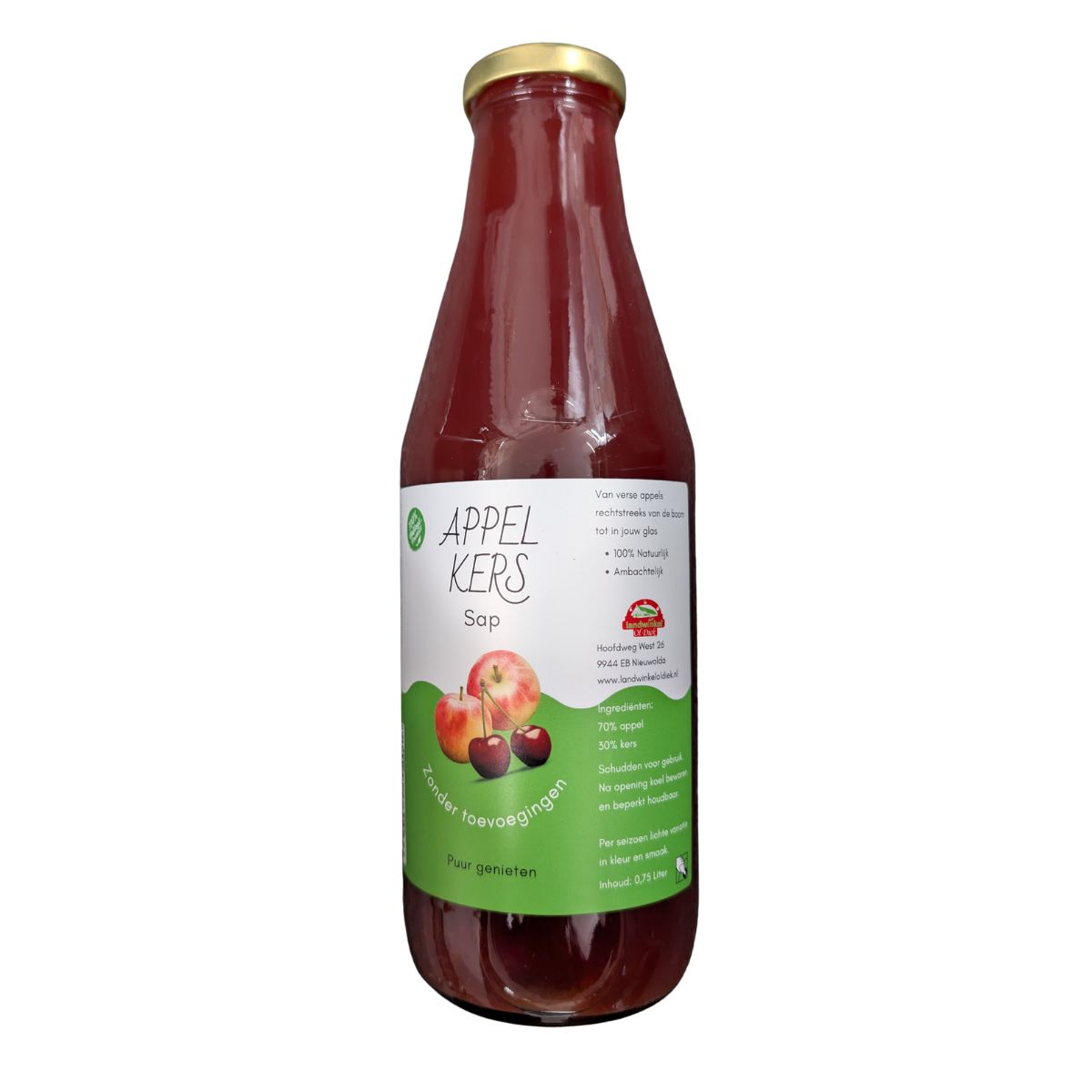 Groninger Dubbelsap appel/kers Deze heerlijke zachte sap is gemaakt van 70% appels en 30% kersen uit de boomgaard van Ol Diek uit Nieuwolda. 100% Natuurlijk, ambachtelijk en zonder toevoegingen in fles van 0,75 ltr.