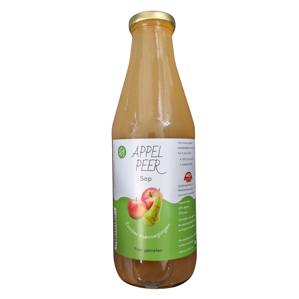 Groninger Dubbelsap appel/peer Deze heerlijke zachte sap is gemaakt van 65% appels en 35% peren uit de boomgaard van Ol Diek uit Nieuwolda. 100% Natuurlijk, ambachtelijk en zonder toevoegingen in fles van 0,75 ltr.