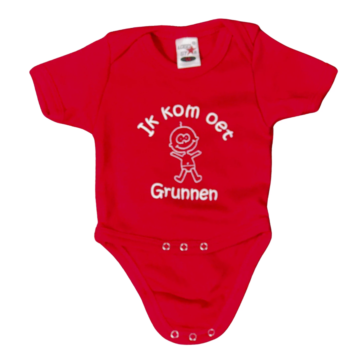 Rode rompertje met tekst: Ik kom oet Grunnen Maten: 56, 68 en 80