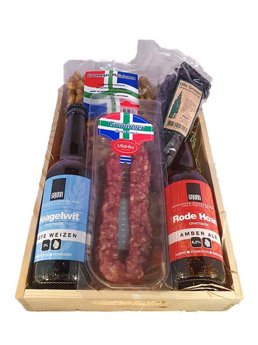Cadeaupakket Bier en Hartig. Inhoud Groninger kerstpakket: houten kistje, 2 flesjes Grunn bier, grunneger mollebonen, martinitorendrop en een Groninger metworst.