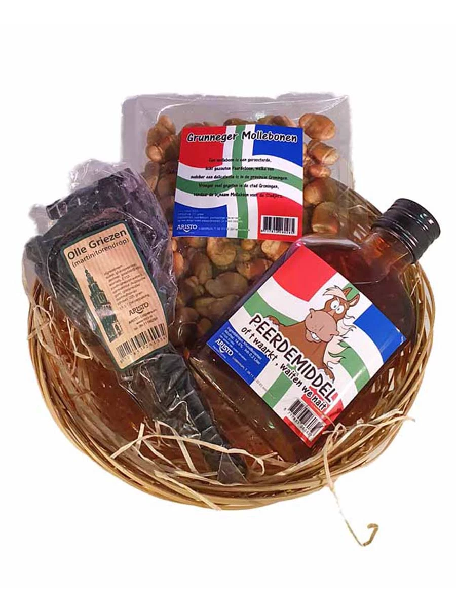 Inhoud: broodmand rond, grunneger mollebonen, martinitorendrop, peerdemiddel.