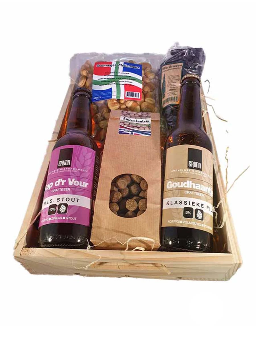 Inhoud: houten kistje, kop d’r veur bier, knienekeutels, grunneger mollebonen, goudhaantje bier, martinitorendrop.