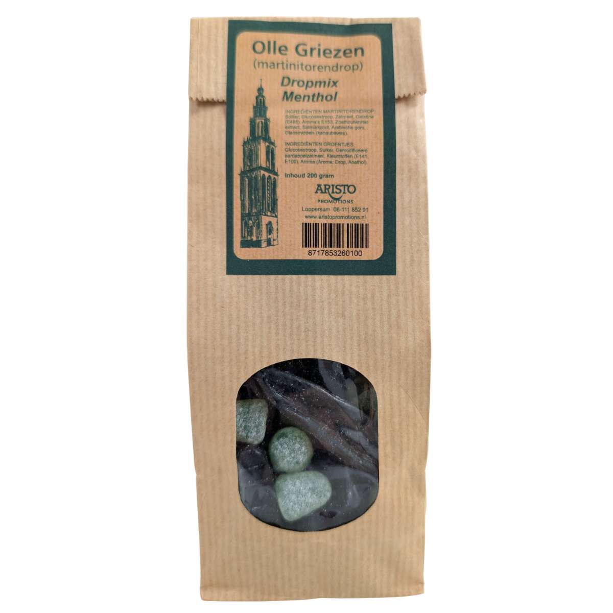 Een mixzakje van 200 gram met Martinitoren drop met menthol gom.