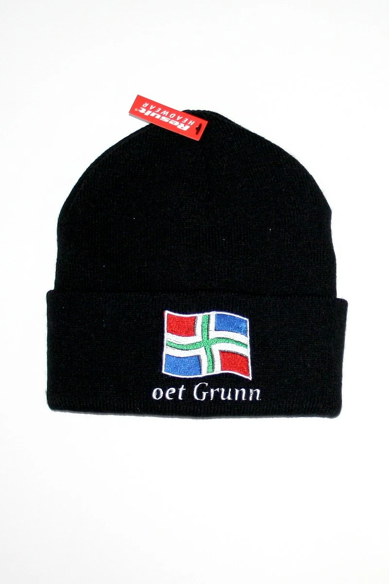 Muts Groningen. Gebreide muts met geborduurde groninger vlag en tekst “oet Grunn”.