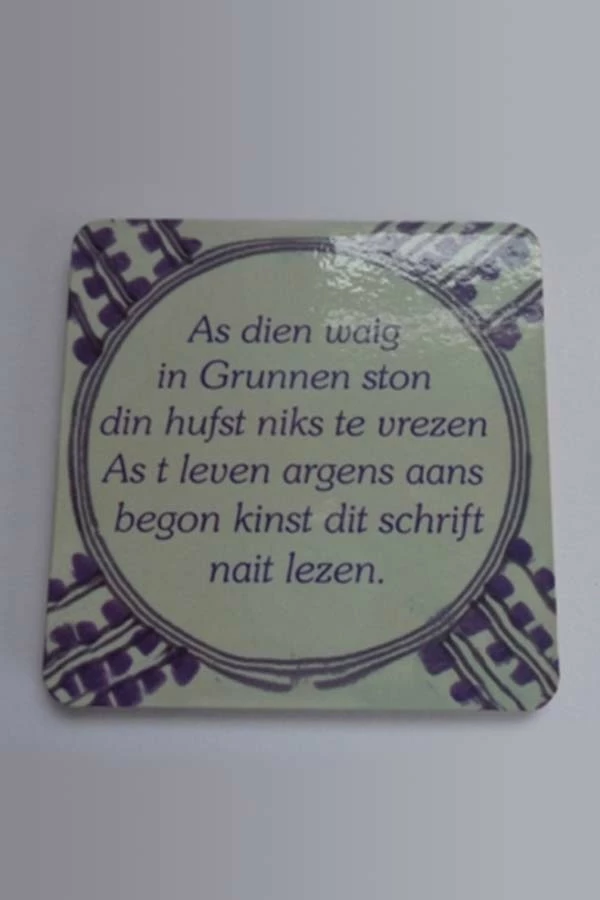 Onderzetter van kurk. Met Groningse spreuk: “As dien waig in Grunnen ston din hufst nikt te vrezen As t leven argens aans begon kinst dit schrift nait lezen”