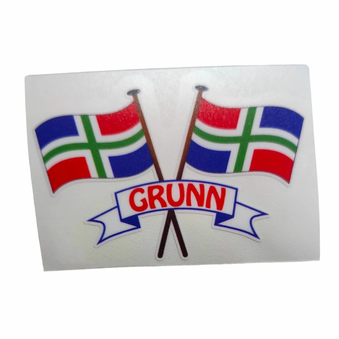 Dubbele sticker 30 x 40cm. gekruist, in de kleuren van de Groninger vlag met tekst GRUNN eronder.
