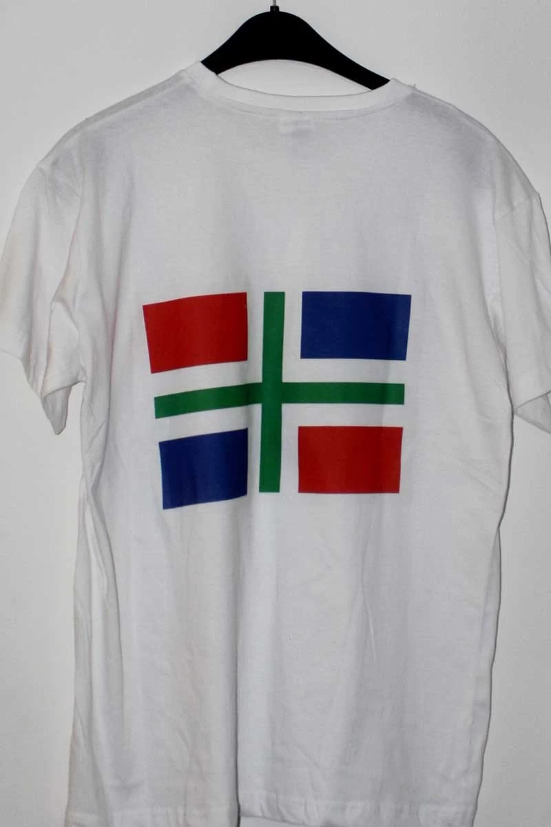 T-shirt met op de voorkant de tekst “Ik bin de kloukste thoes” en op de achterkant de Groninger vlag.